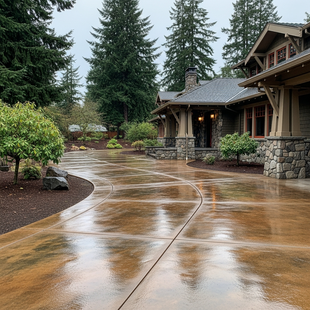 For residential exterior applications, we typically recommend acid stains sealed with high-solids acrylics or penetrating silane/siloxane blends. These systems withstand vehicle traffic, de-icing salts, and Oregon’s freeze-thaw cycles when properly maintained. Colors should be selected to complement existing home exteriors—earth tones like terra cotta, charcoal, and sandstone remain popular throughout Salem’s established neighborhoods.